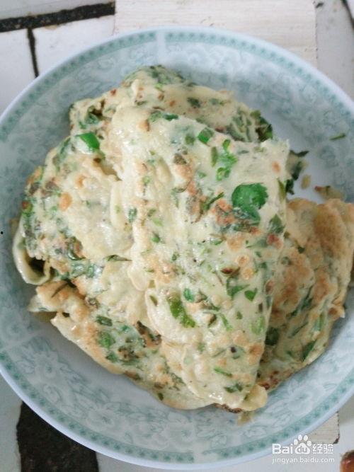 将煎好的香椿饼取出,切成小块,撒上葱花,即可享用。